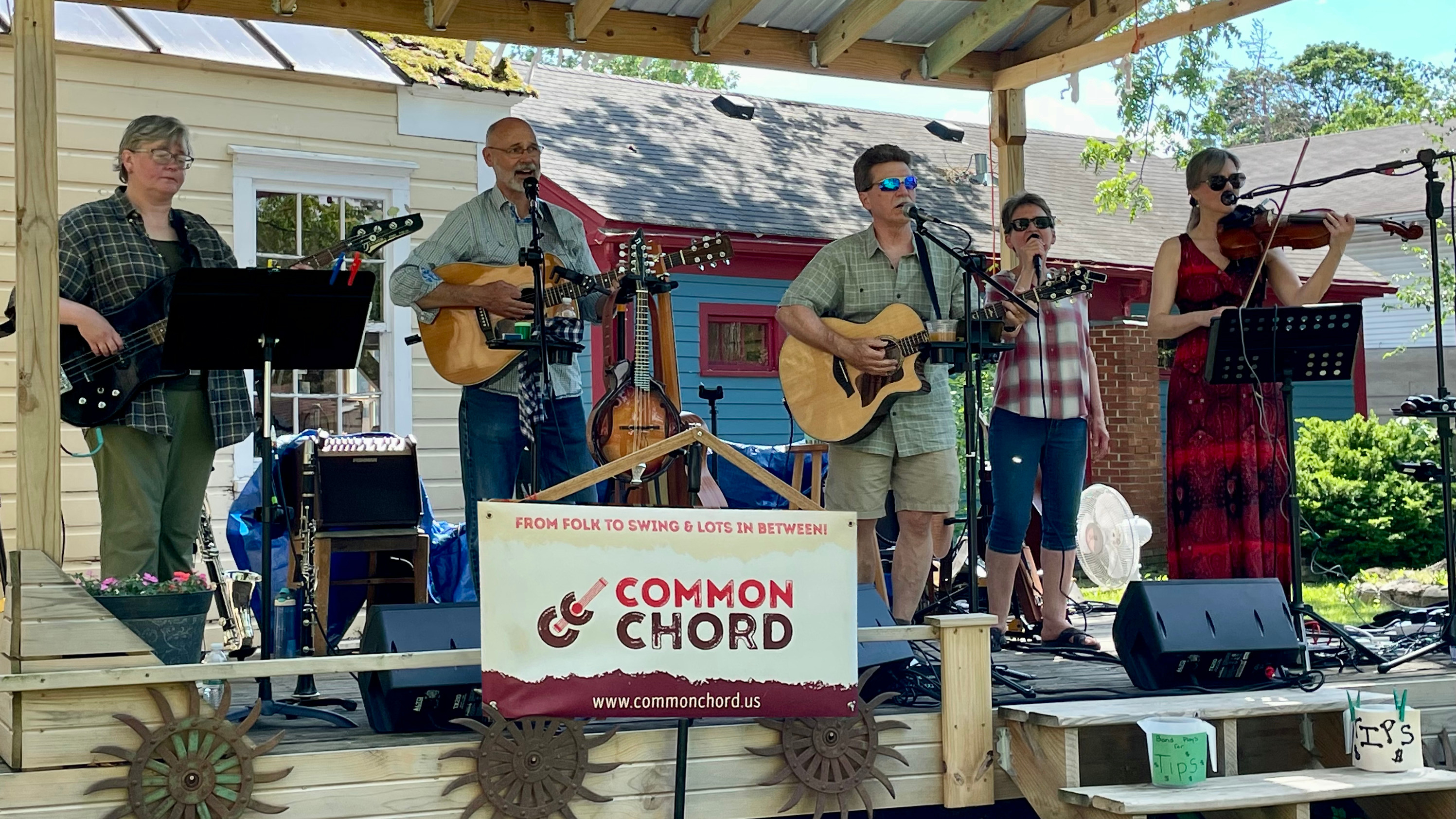 With their unique combination of vocal, instrumental, songwriting and composing/arranging skills, Common Chord creates a delightful soundscape. Common Chord performs great arrangements built around 4-part harmonies with flavors of folk, swing, bluegrass, blues, rock/pop & more, with appeal to all ages. The group focuses on originals plus unique covers from the likes of Tom Waits, the Beatles, Robert Johnson, Paul Simon, Gershwin, and lots more, and even some eclectic version by groups such as Styx and Yes. Shows include use of guitars, bass, guitar, mandolin, fiddle, clarinet, cigar box guitar, percussion, and sometimes cello and more. Members: Michael Bryant (co-director, vocals, guitar, bass, mandolin); Tracy Jane Comer (co-director, vocals, guitar, viola); Bruce Buttel (guitar, vocals); Delores Jenison (vocals); and Faye Bruggink (clarinets, bass).